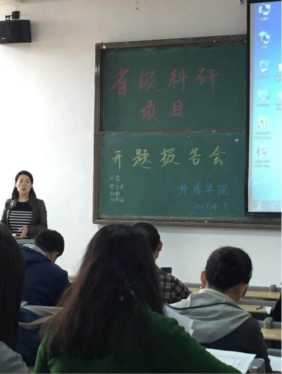 2017年4月5日下午外国语言文学学院在教一101举行省级项目开题报告会,院长任晓晋教授、英语系主任胡孝申教授和商务英语系何康民教授参加本次会议,分别对四位老师的科研项目进行审核并提出建议。科研处领导莅临指导工作,外国语言文学学院其他专职老师也到场观摩学习。