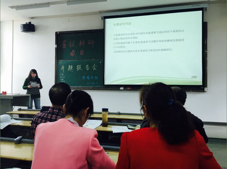 会上,孙霞老师阐述了她的课题“大学英语综合课文本教学实践研究”,认为长期以来英语教学只重视语言的基础知识,忽视了高一级层次的文本赏析能力。樊金琪老师主持的项目名称是“新媒体时代碎片化英语学习效能研究”,旨在分析新媒体时代环境下大学生英语学习过程中存在的障碍并试图找到提高大学生英语学习有效性的策略。杨静老师主持的课题名称是“教育生态学视阈下民办高校大学英语教师角色定位及其实现”,认为在一些因素的影响下,民办高校大学教师角色发生了转变并提出生态化转型策略。张荷瑶老师项目的题目为“近三十年来环境史英文著作的中文译本研究”,着重打算对环境史英文著作的中译本的翻译方法与技巧进行研究。