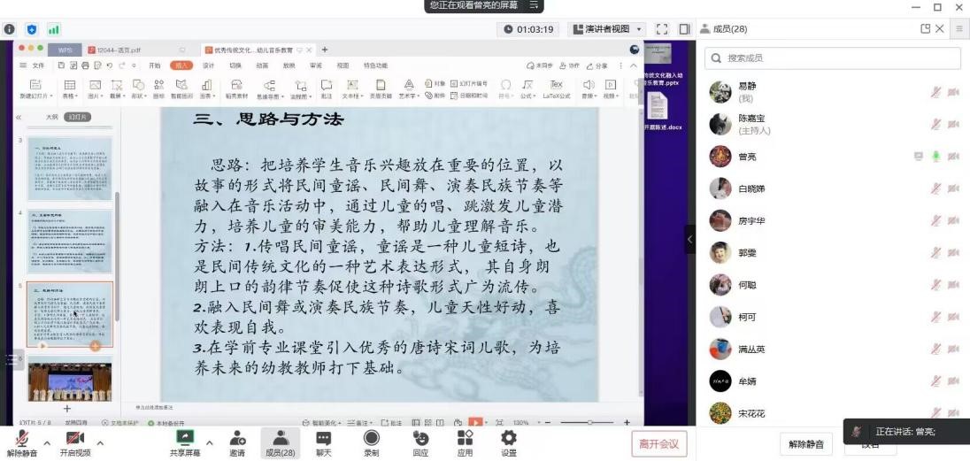 曾亮老师立项课题为2022年度湖北省教育厅教育规划项目《优秀传统文化融入幼儿音乐教育的有效途径研究》。曾老师拟通过幼儿音乐审美教育,培养提高幼儿的审美能力,帮助幼儿理解音乐。在幼儿音乐启蒙教育中插入传统文化与民族艺术的教学,培养幼儿对传统文化的感悟和认知,从而滋润孩子们的音乐灵性,逐步增强幼儿童国家的认同与归属感。