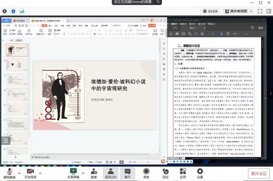 徐莉红老师立项课题为2022年度湖北省教育厅哲社科项目《埃德加·爱伦·坡科幻小说中的宇宙观研究》。徐老师指出,宇宙观昭示了人类启示录。他关注时代科技的发展进步,构建文学作品的科学幻想,指出宇宙消解和寂灭的暗淡前景,其所建立的科学假说和哲学观念与后现代的世界一脉相通。