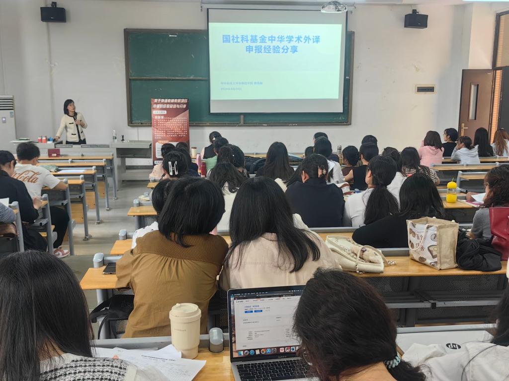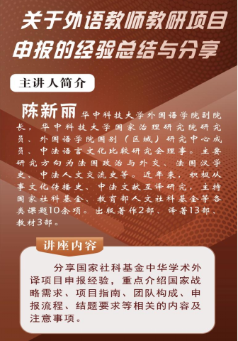 4月24日下午,学院邀请到了华中科技大学yl6809永利集团副院长陈新丽教授在教1-102开展学术讲座,就国家社科基金中华学术外译项目的申报经验进行交流分享。活动由徐威老师主持,学院全体专任教师、部分优秀学生代表参加了本次讲座活动。
