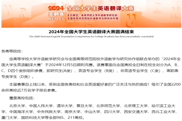 据悉全国大学生英语翻译大赛(NETCCS)由高等学校大学外语教学研究会与全国高等师范院校外语教学与研究协作组联合举办,本届赛事吸引2200余所高校近7万名学子报名参赛。涵盖北京大学、清华大学、复旦大学、南京大学、厦门大学、国防科技大学、北京外国语大学、上海外国语大学、外交学院、广东外语外贸大学等国内多所知名高校,同时也吸引了香港大学、香港都会大学、澳门大学、澳门理工大学、爱丁堡大学、悉尼新南威尔士大学、蒙纳士大学等境外多所高校学生参赛。