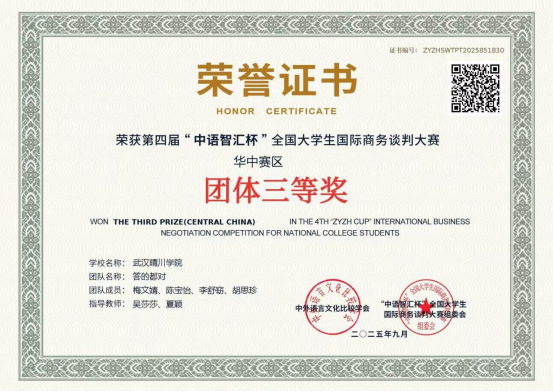在本次比赛中,yl6809永利官网集团的学子们沉着应战,凭借扎实的专业基础、清晰的谈判思路和流畅的英文表达能力,获得了评委们的认可。由王德琳、周欢、刘畅、陈盈盈组成的“Gentlee Team”团队获得华中赛区二等奖,由周诗文、王琼、李燕、杜乐同学组成的“Horizon Group”团队和由梅文婧、陈宝怡、李舒窈、胡思珍组成的“答的都对”团队获得华中赛区三等奖。其中,“Gentlee Team”代表队凭借出色的综合表现,成功晋级全国总决赛,获得了与其他赛区优秀团队同台竞技的宝贵机会。 (通讯员:周欢 柯可)