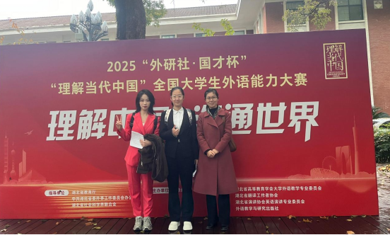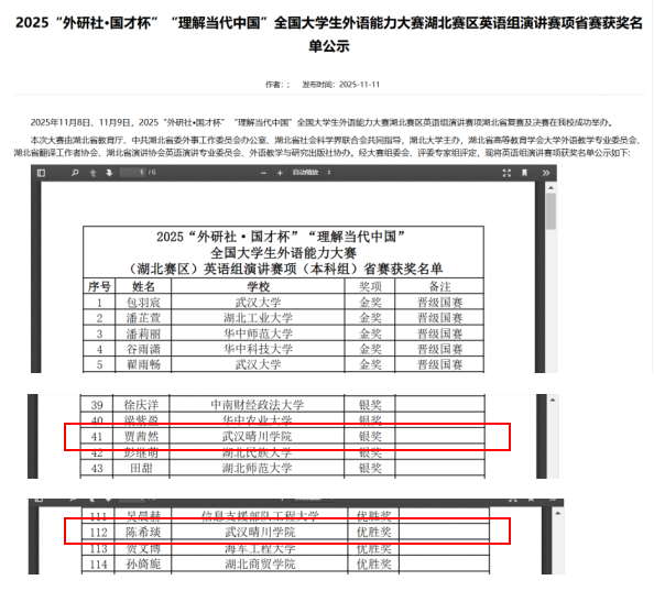 作为高校外语领域的国家级A类赛事,此次 “外研社・国才杯” 省赛汇聚全省 68 所高校的 203名精英选手,武汉大学、华中科技大学等名校学子同台竞技。赛事以 “即兴发挥初赛 + 定题演讲、即兴发挥与问答复赛” 的双阶段考核模式,全方位检验选手的语言功底、思辨能力与跨文化表达素养。面对高强度竞争,我校选手沉着应战。贾茜然同学凭借对中国发展实践的深刻理解,在首日即兴演讲中以清晰的逻辑架构与鲜活的现实案例脱颖而出,成功晋级复赛;次日再以富有感染力的表达与从容的临场表现,最终斩获省级二等奖,用青春之声诠释了当代青年的家国情怀与国际视野。陈希琰同学亦在赛事中展现出扎实的语言素养与严谨的思辨能力,获得优胜奖,充分彰显晴川学子克难奋进、昂扬向上的精神风貌。