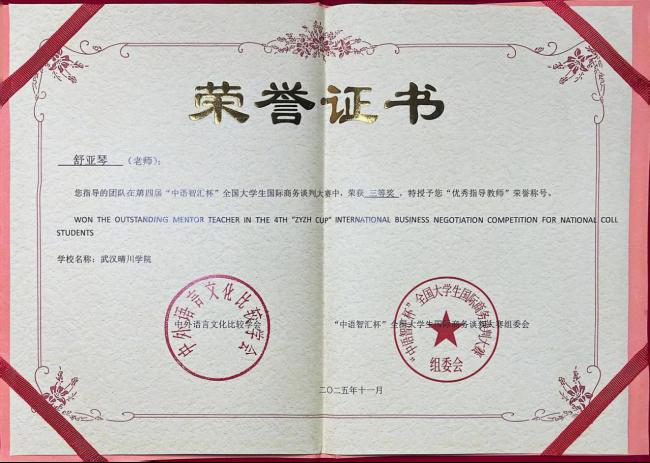 近日,在第四届“中语智汇杯”全国大学生国际商务谈判大赛全国总决赛中,yl6809永利集团柯可、舒亚琴两位教师指导的队伍(团队成员:王德琳、周欢、刘畅、陈盈盈)与来自全国高校的143支晋级队伍展开激烈角逐,最终凭借稳定的表现荣获全国三等奖。同时,柯可、舒亚琴老师获评“优秀指导教师”,柯可老师还应邀担任了全国决赛评委。