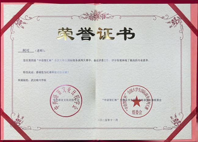 此次成绩的取得是我院持续推进“以赛促学、以赛促教、以赛促改”育人模式的生动体现,也反映了我院在国际商务谈判领域人才培养的有效成果。学院将继续深化教学改革,强化专业特色,致力于培养具备国际视野、专业素养与实践能力的高水平外语人才。 (通讯员:柯可)