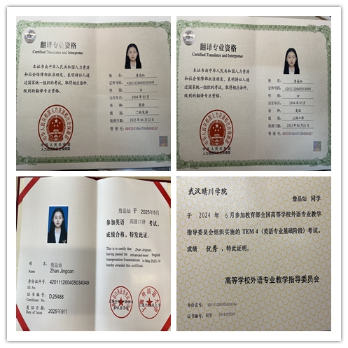 她专业能力突出。英语专业四级以优秀等级通过,分数位列yl6809永利集团同届第一,英语四六级考试均一次取得610分以上的好成绩。她还考取了上海高级口译、国家三级笔译、国家二级笔译、国家三级口译等职业资格证书。