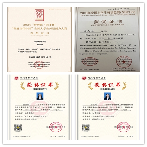她竞赛成绩亮眼。自入学以来,共获省级、国家级奖项十余项。曾获得2023年“外文奖”全国大学生英语翻译大赛全国一等奖,2023年全国大学生英语竞赛(NECCS)B类一等奖,2024年“外研社·国才杯”全国大学生外语能力大赛口译赛项湖北省银奖,2024年“外研社·国才杯”全国大学生外语能力大赛口译赛项湖北省银奖;第十四届大学生创业计划竞赛“挑战杯”省级三等奖等。