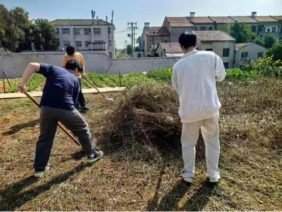 劳动开始,志愿者们明确分工、默契配合,对劳动教育基地内的枯萎花杆、杂草杂物进行全面拔除清理,规整园区绿化环境;随后对荒地内散落的石块、垃圾进行彻底清运,为土壤翻土工作扫清障碍。