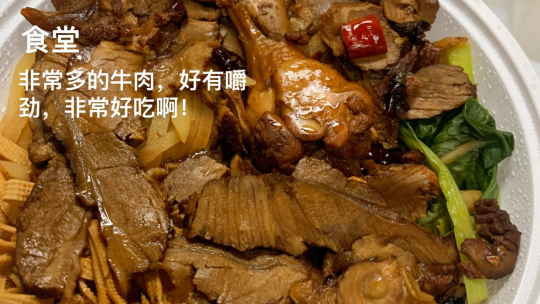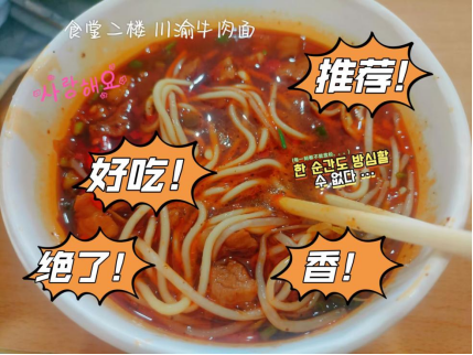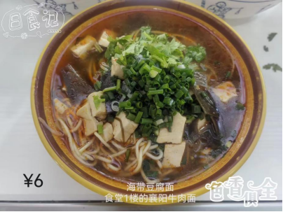 图上是食堂一楼的襄阳豆腐面,咸辣适中,要趁热吃;面里有虎皮鸡蛋、海带等一些辅菜,一碗面里面就吃到了主食、蛋白质、纤维素等人体必需的营养元素,不仅吃得好,还吃的健康,推荐给大家!