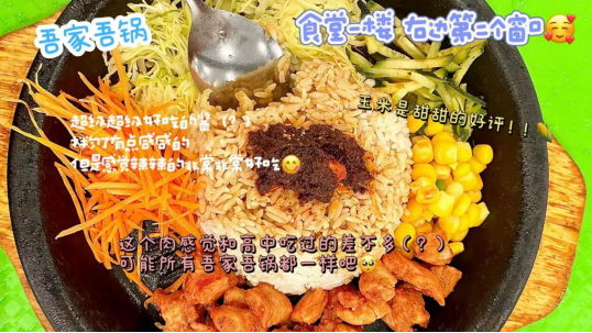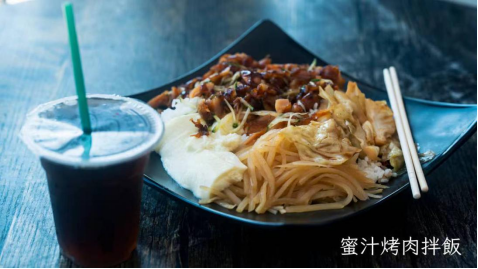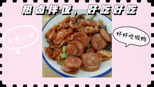 食堂三楼的陈记烤肉拌饭,配菜丰富,米饭饱满粒粒分明,甜口的蜜汁酱给米饭增添独特风味。