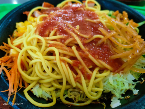 图中美食为番茄鸡排意面,以番茄酱覆于表面,搭配胡萝卜丝与生菜,色彩鲜明,面条劲道。(拍摄于食堂一楼吾家吾锅)