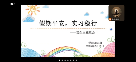 会后,各班通过腾讯会议平台召开暑期安全线上班会,实现学生全覆盖。班会上,班主任结合典型案例,重点提醒学生注意防溺水、防诈骗、兼职安全及心理健康,并逐一核实学生假期去向,建立紧急联络机制。学前202201班班主任吴倩黛老师特别强调:“暑期兼职需选择正规单位,遇到问题及时联系学校或家长。”学生们纷纷表示将严格遵守安全要求,度过平安充实的假期。