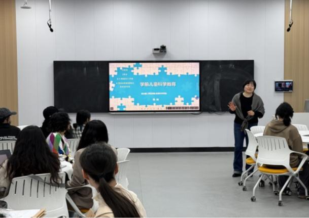 在教学示范环节中,陈纳老师主讲《学前儿童科学教育概述》。陈老师从理论与实践相结合的角度出发,强调了科学教育在学前教育中的重要性,深入剖析了当前教师在职业认同、育人意识、科学教育价值挖掘以及教学方法创新等方面存在的不足,提出了“知识、能力、情感”三维目标体系,详细讲解了本土化双元中心设计思维教学法。她还通过结合家庭、社会和幼儿园三大教学模块,系统阐述了模块化设计与社会热点融入的具体策略。
