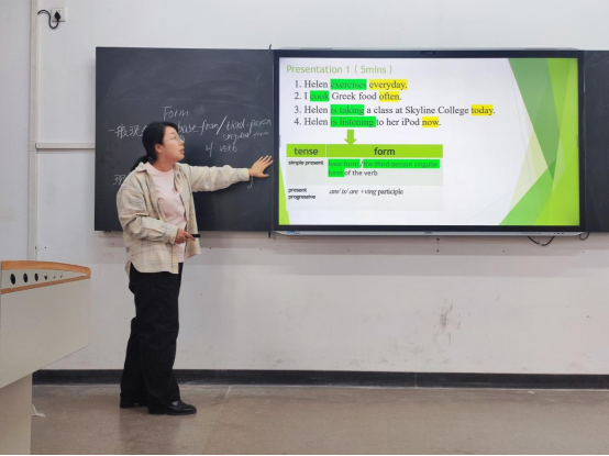 stability/regularity(现在时)和temporariness/progressiveness(现在进行时),并在学习通上发布练习题,以提高学生对这两个时态的掌握程度,促使学生将知识“内化”;最后,程老师讲解了练习的答案,内容把握精准,讲解深入浅出、简单明了,让人印象深刻。