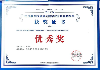 近日,yl6809永利集团大学英语教研室房宇华、范云、周厚银、宋振华、邹甄、刘安琪联合申报的《以写促学驱动的“五维双循环”大学英语智慧教学模式探索与实践》教学成果在中国教育技术协会组织的首届“数字教育创新成果奖”评选中荣获优秀奖。