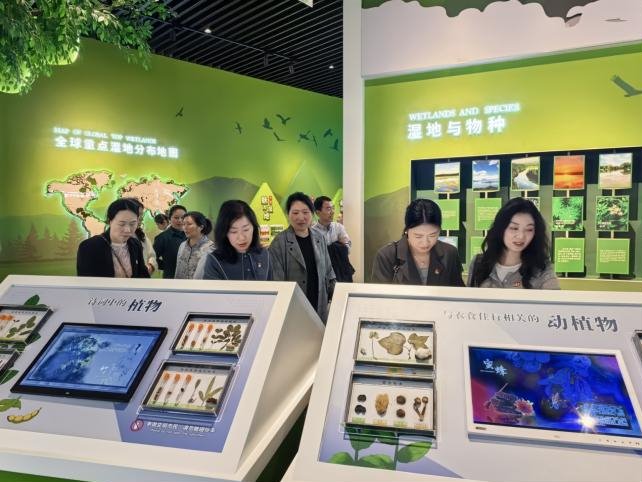 梁子湖生态文明馆作为华中地区首个以湖泊保护、水生态修复、水生物多样性保护为特色的研究展示中心,不仅是梁子湖区的“城市会客厅”,更是集中展示“绿水青山就是金山银山”理念实践成果的重要窗口。在讲解员的引导下,党员教师们依次参观了馆内“梁子湖生态文明史”、“湿地生态系统科普”和“两山发展排头兵”三大展示区。通过沉浸式的光影体验、翔实的文史资料以及生动的生态治理案例,让大家深入了解了梁子湖区在生态环境保护与绿色转型发展背后的故事。